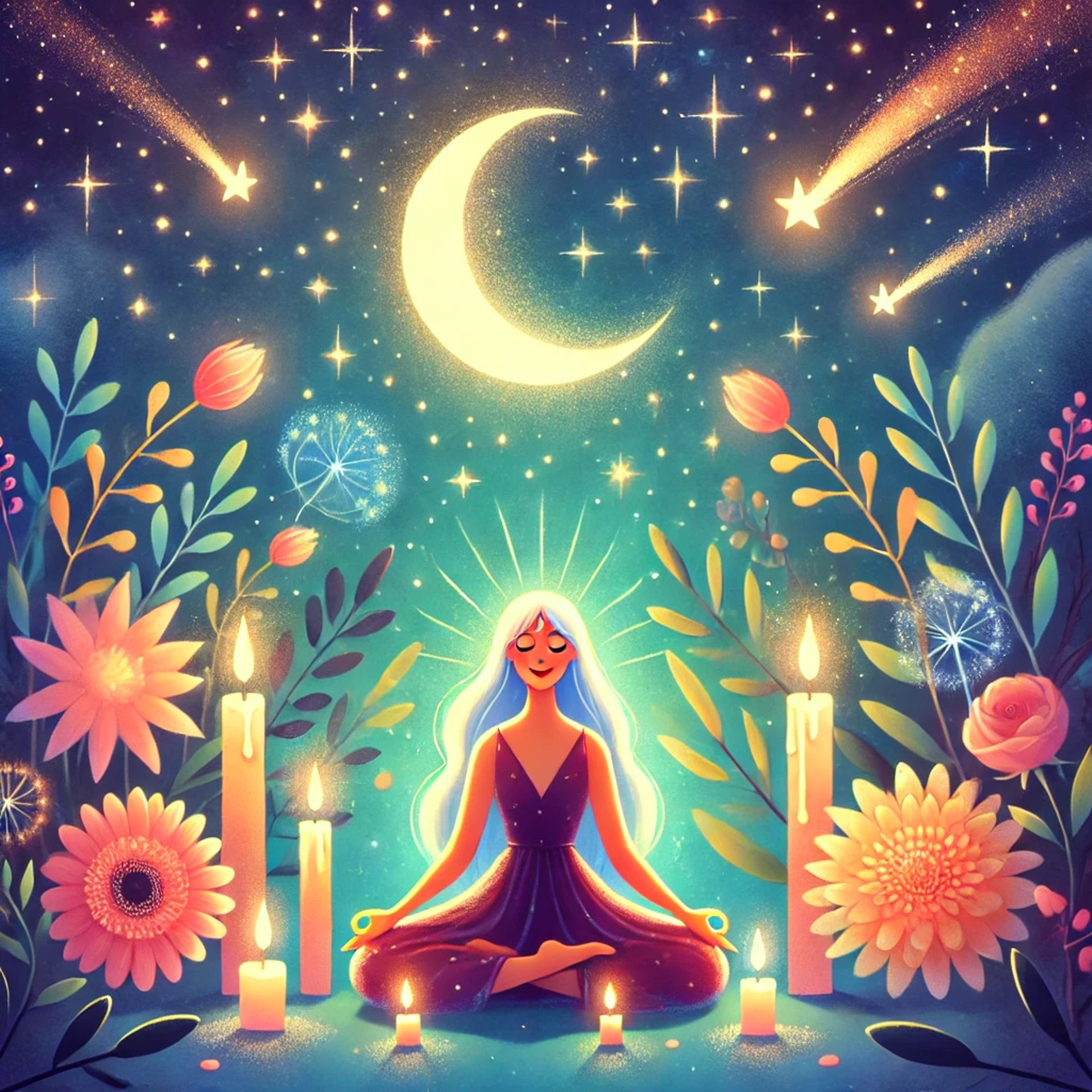 She sat beneath the crescent moon, bathed in the glow of candlelight, her breath rising and falling in harmony with the universe. Around her, the flowers swayed as if they, too, were listening. The stars above pulsed, ancient and knowing, their light trickling down like whispered secrets.